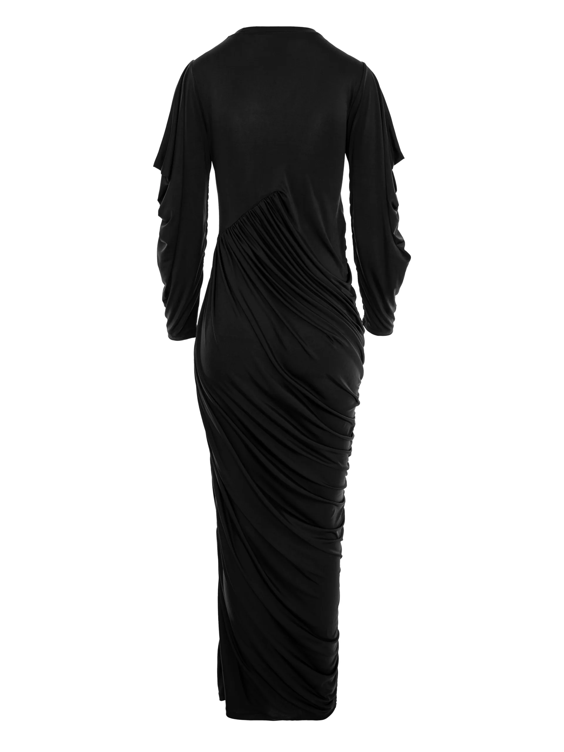 Round neckline, armholes with raw edges, long to ankles.  Dress created from fine black stretchy lycra with front and back ruffles. In the back the eye drops down the entire garment with a cheeky finish.